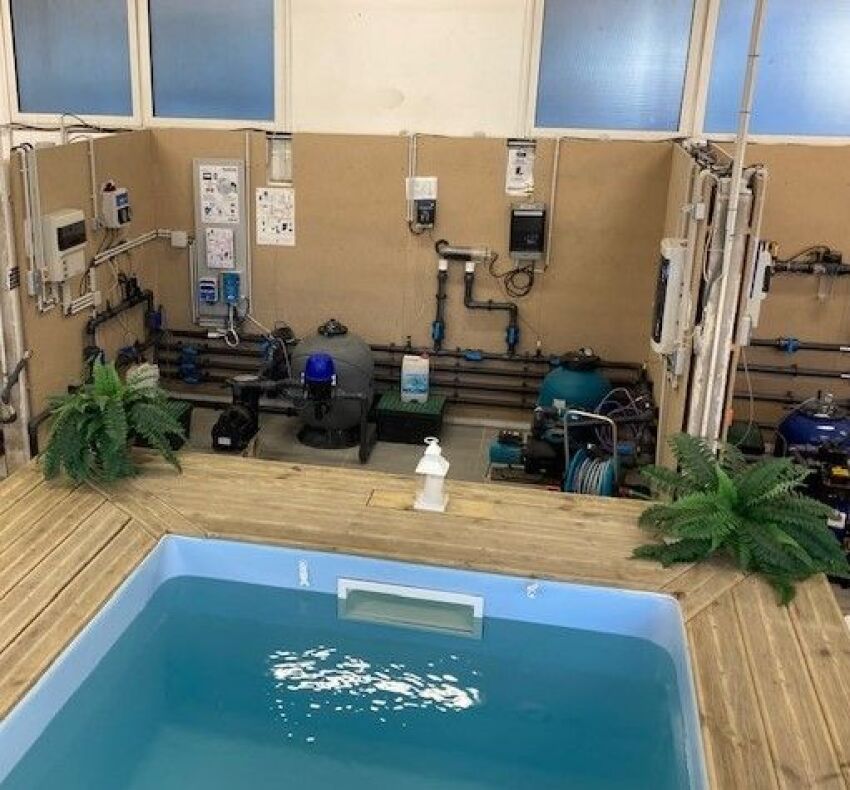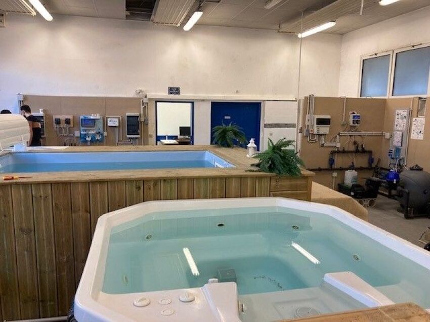 En intérieur, on retrouve un bassin pédagogique, un spa, des modules individuels pour s’entraîner sur les installations techniques, ainsi qu’une salle de classe. Une partie de l’atelier est dédiée au traitement de l’eau.