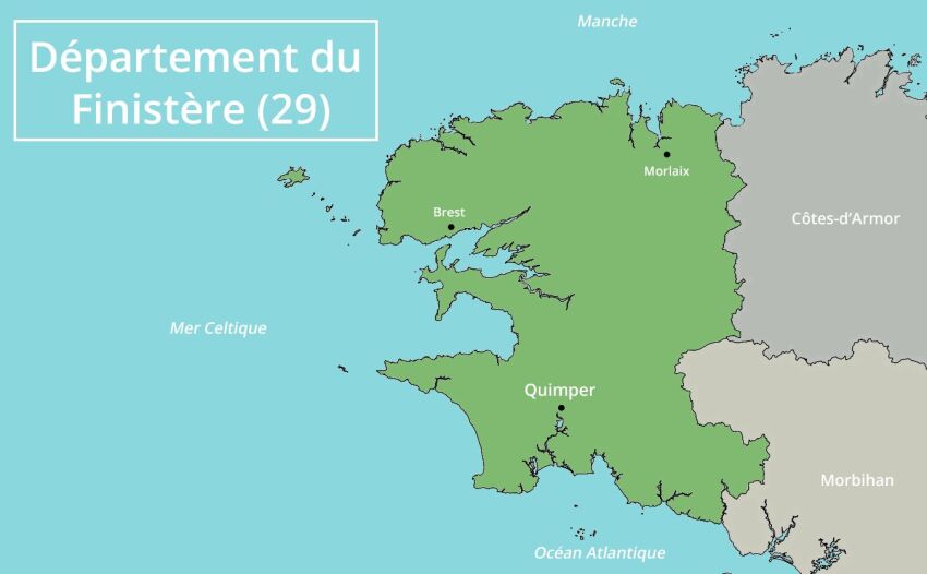 Le Finistère (29) est le département situé le plus à l’ouest de la France. Bordé par la Manche, la Mer Celtique et l’Océan Atlantique, ses 1250km de côtes regroupent 10% des communes littorales du pays. Le département bénéficie d’un climat tempéré océanique, il ne se situe ni dans les départements les plus chauds ni parmi les plus ensoleillés. Il s’agit cependant du 2e département le plus pluvieux de France, avec 1270mm de précipitations moyennes en 2020 (les Pyrénées-Atlantiques, département le plus humide de France, totalisait 1334mm de précipitations en 2020).