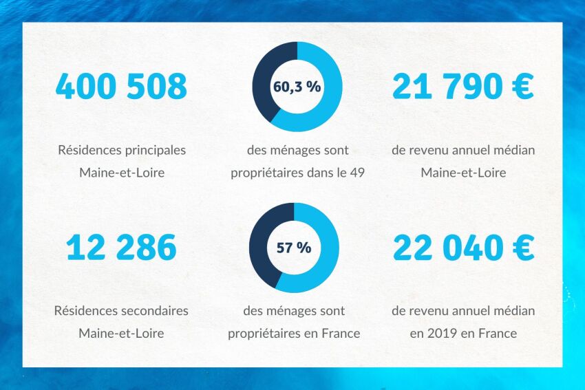 Les maisons sont représentées en grande majorité dans le Maine-et-Loire. En effet, 69,6% des logements des Angevins sont des maisons, et seulement 29,2% sont des appartements. De plus, 60,3% des habitants sont propriétaires de leur logement, et le nombre de construction de maison a augmenté de 3% en 5 ans.