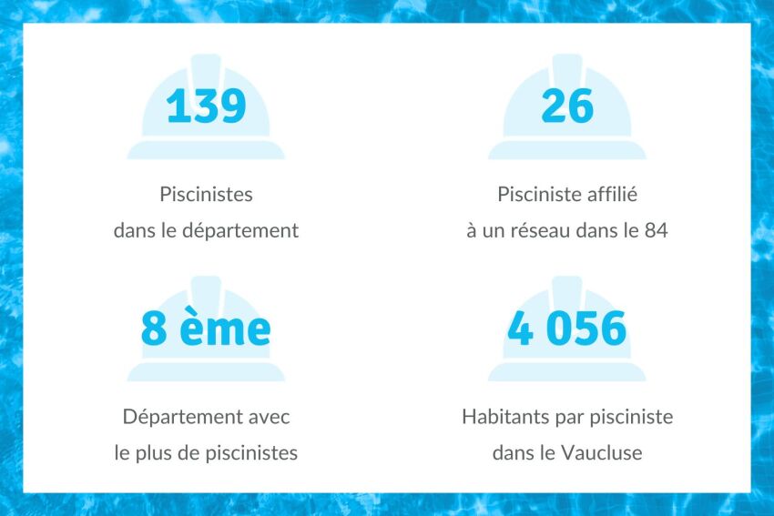 Avec 139 professionnels de la piscine recensés dans l’annuaire de Guide-Piscine, le Vaucluse est le 8ème département de France en termes de concentration de piscinistes. Ce chiffre semble très important mais, sachant que la population totale s'élève à 563 751 Vauclusiens, il ne représente qu’un ratio d'un professionnel pour environ 4 056 habitants.