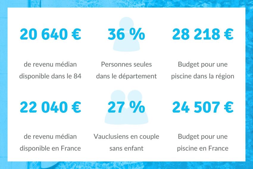 Concernant le revenu, le revenu médian disponible par unité de consommation s'élève à 20 640 €, ce qui est inférieur au médian régional et national. Toutefois, cette donnée doit être mise en perspective avec le budget régional moyen consacré à la construction de piscines, qui s'établit à 28 218 €. Ceci indique que malgré des revenus plus faibles, les habitants du Vaucluse sont disposés à investir dans des projets de piscines. On constate d'ailleurs que, selon notre étude auprès des piscinistes du Vaucluse, le budget pour la construction de piscine des clients se situe entre 25 000 € et 40 000 €.