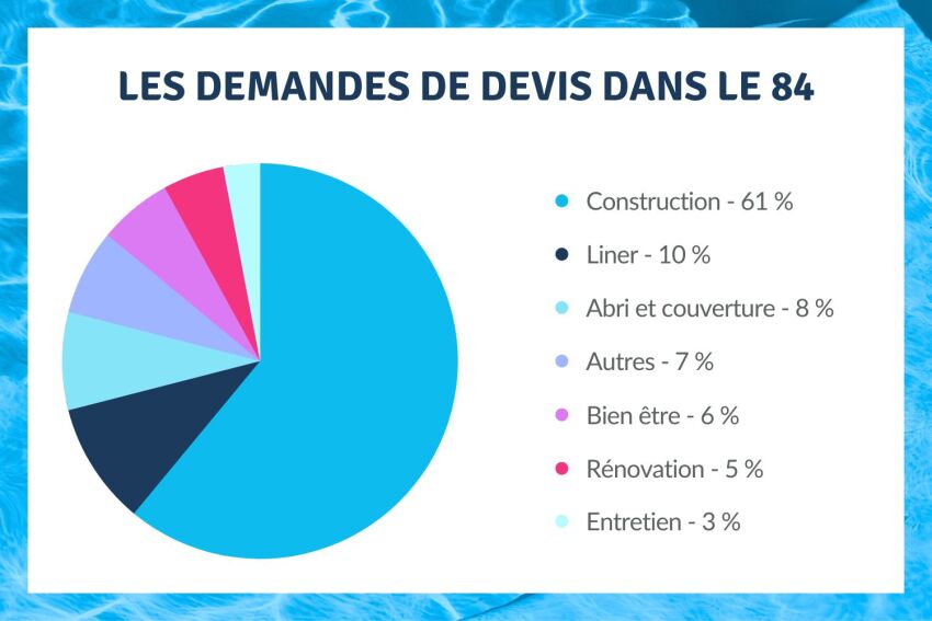 Parmi l'ensemble des demandes de devis, nous constatons que 61% sont liées à la construction de piscine. Ce qui indique une forte tendance à la création de nouveaux bassins, plutôt qu’à l’entretien ou la rénovation des installations existantes. Le potentiel pour une entreprise spécialisée dans la construction de piscines est donc particulièrement élevé dans le Vaucluse.