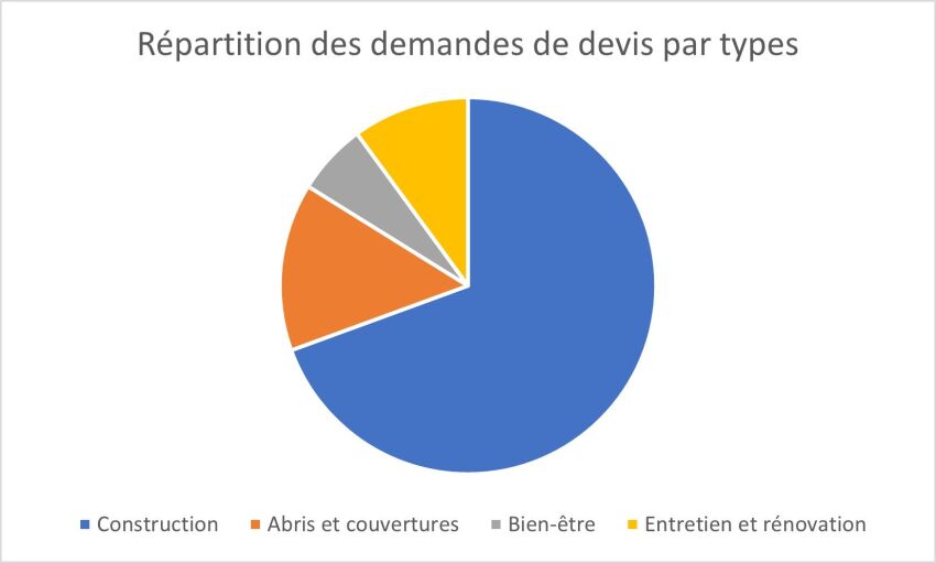 Une grande majorité des demandes de devis laissées sur le site concernaient de la construction de piscines (70%), 14% des demandes concernaient l’installation d’un abri ou d’une couverture de piscine, 10% concernaient l’entretien ou la rénovation de piscines, et 6% concernaient l’installation d’équipements de bien-être (spas, saunas ou hammams).