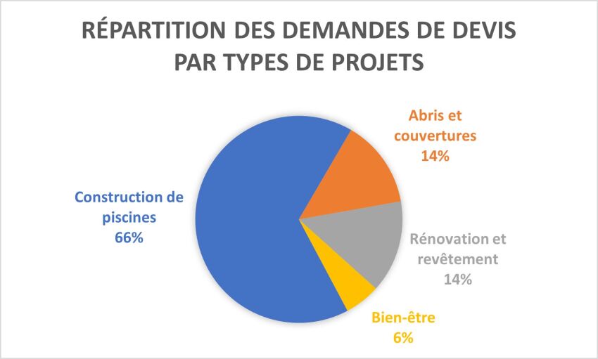 Si l’on se penche sur les types de projets, on constate que la plupart des demandes concernent des piscines enterrées (77%), 15% des demandes concernent des piscines semi-enterrées, et 8% des piscines hors-sol. Sans surprise, les types de piscines les plus demandés sont les piscines en béton (37%) et les piscines coque (32%). Côté couvertures, ce sont les abris de piscine qui ont le plus de succès, avec 43% des demandes, suivis de près par les volets, qui totalisent 40% des demandes.