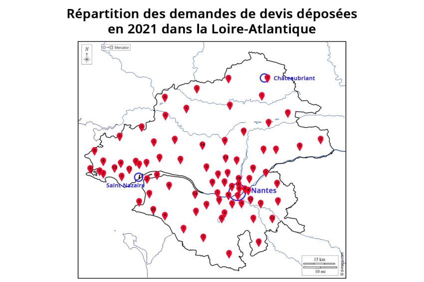 En 2021, Guide-Piscine.fr a enregistré 439 demandes de devis sur le département de la Loire-Atlantique, soit 2,3% du nombre total de leads enregistrés sur le territoire. Le ratio lead/pisciniste s’élève à 5,4, chiffre supérieur à la moyenne nationale qui est de 3,8.