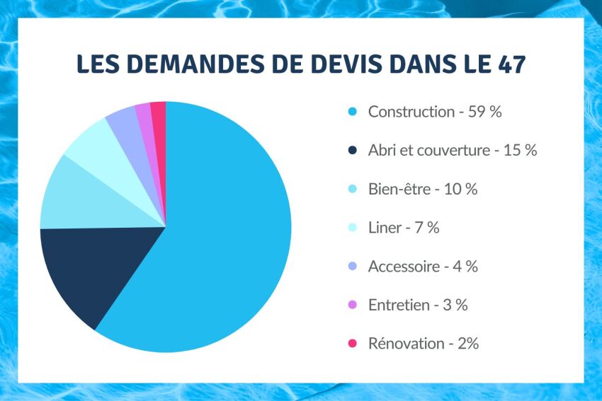 En 2021, 144 demandes de devis ont été validés dans le Lot-et-Garonne sur Guide-Piscine. Dans le 47, chaque pisciniste a réalisé 1,98 leads ce qui est en dessous de la moyenne nationale de 2,88 demandes par piscinier. Ces devis concernaient principalement la construction et l’entretien de piscine. Le département se place ainsi 42ème des départements avec le plus de demandes de devis validées au cours de l’année 2021.