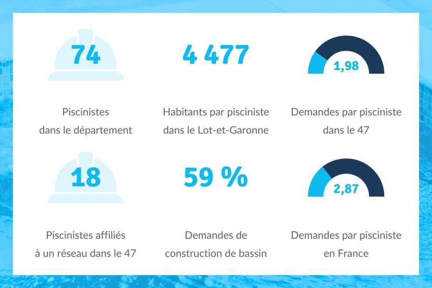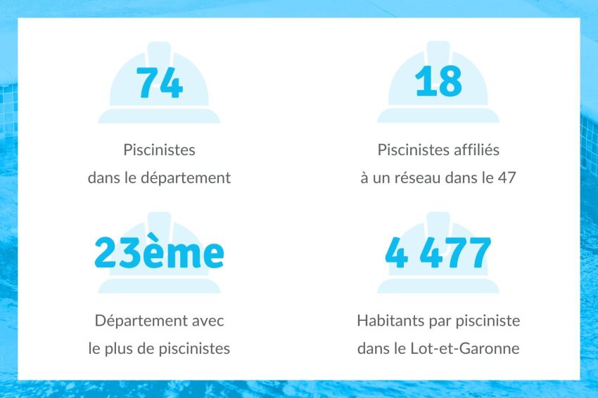 L’annuaire des installateurs de Guide-Piscine recense 74 piscinistes dans le Lot-et-Garonne dont 18 appartiennent à un réseau. Avec ses 331 271 habitants, le département dispose d’un pisciniste pour 4 477 Lot-et-Garonnais. Il se place à la 23ème place des départements avec le plus de piscinistes.