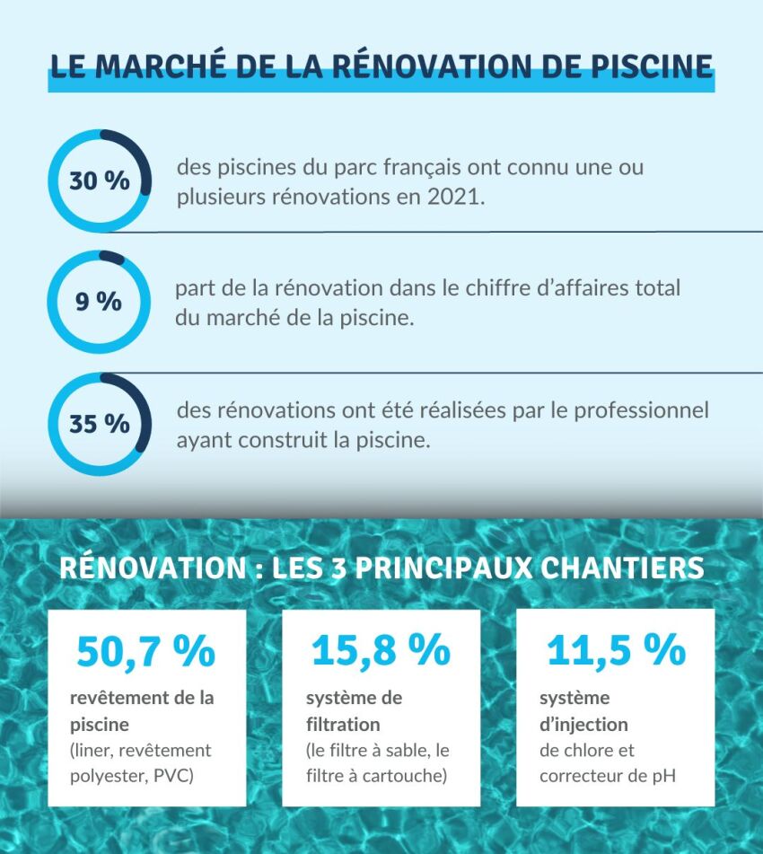 La France compte désormais plus de 3 millions de piscines, dont une bonne partie (environ 850 000) qui ont été construites il y a plus de 10 ans. Ces anciens bassins sont souvent vieillissants, peu équipés des dernières innovations, très énergivores et peu confortables. En 2021, 30,1% du parc de piscines a connu une ou plusieurs rénovations (chiffre : FPP, Étude Consommateurs Décryptis 2022).