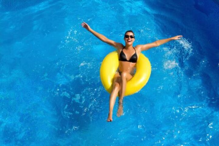 Elle est équipée d'un grand bassin de natation, d'une pataugeoire pour les plus petits et d'un solarium.