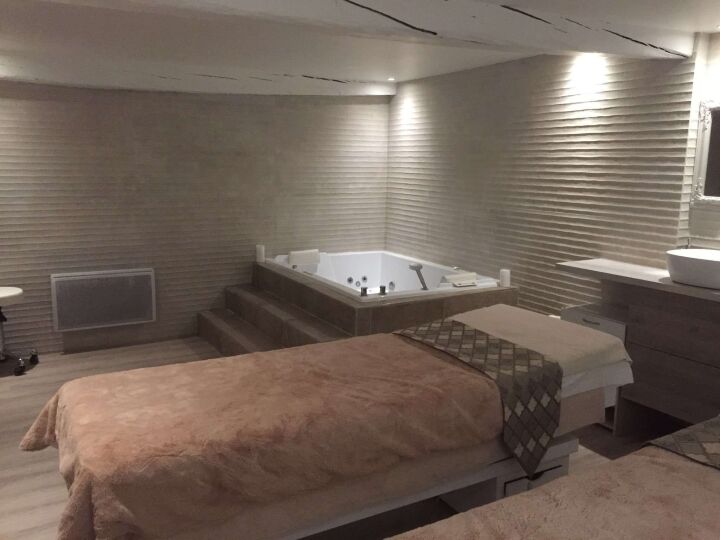 - 1 espace lounge avec spa de nage, un espace tisanerie