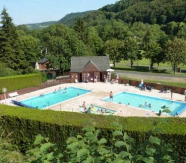 Après la baignade dans cette piscine municipale du Cantal, le solarium engazonné permet de se reposer au soleil.