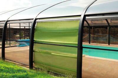 - Certaines toitures d’abri de piscine sont amovibles, c’est à dire que les éléments du toit peuvent être enlevés et déplacés à côté de la piscine.