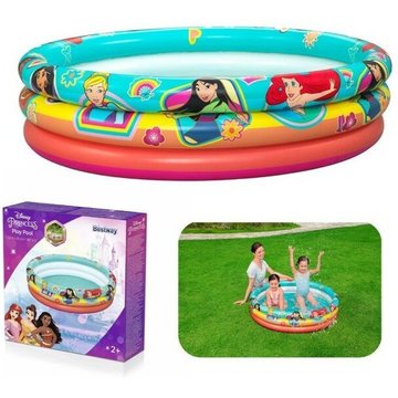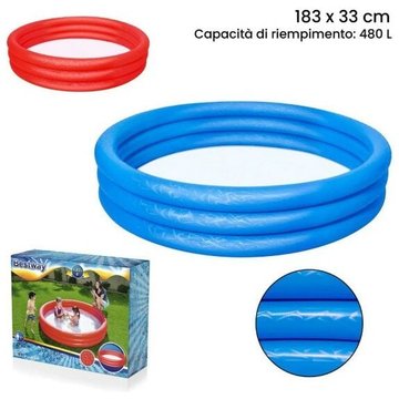 Piscine gonflable pour enfants de forme ronde, confectionnée en vinyle résistant et transparent. La piscine dispose de 2 anneaux transparents arborant des illustrations estivales variées telles que des fruits et des glaces.