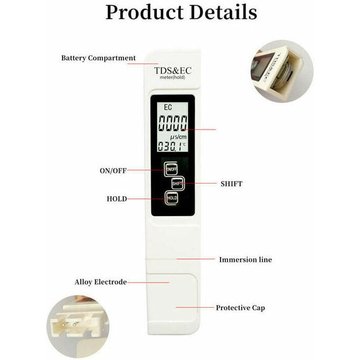 Il s'agit d'un kit de test de qualité de l'eau 4 en 1 qui effectue des tests TDS professionnels, des tests EC, des tests de température et des tests de pH. Doté d'un grand écran LCD rétroéclairé pour améliorer la détection de l'eau potable, l'aquarium hydroponique, l'étang à poissons et la piscine.