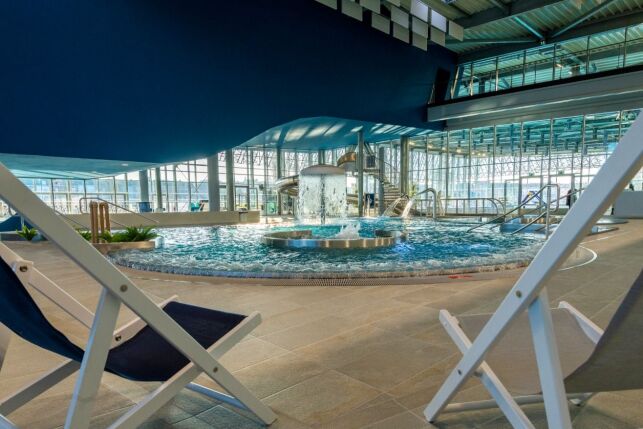 - un bassin ludique de 200 m², d'une profondeur allant de 60 à 120 cm, avec jeux d'eau, une rivière à contre courant, bacs de cygne et une banquette à bulles,