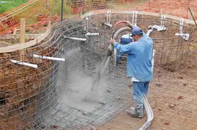 - La piscine en béton projeté. Ici, la structure de base est en ferraille. Le béton est ensuite propulsé à haute pression contre les parois et le fond du bassin (radier). Cette technique est la plus coûteuse car elle permet une liberté totale pour la forme et les dimensions du bassin. Elle nécessite un matériel et un savoir professionnels.