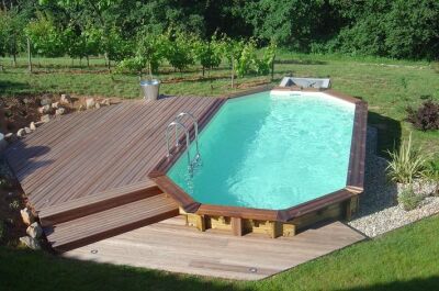 - La plage de piscine. En béton, en bois ou en pierre, la plage de piscine permet d'aménager un espace esthétique et pratique (pour la circulation des baigneurs, pour la propreté de l'eau, pour y installer un solarium avec transats et un salon de jardin!) autour du bassin. Grâce à elle, notre piscine semi-enterrée va vraiment s'intégrer au mieux dans son espace. Compter 2500€ pour le prix moyen d'une terrasse en bois.
