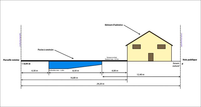 Le plan de coupe doit représenter le bassin, l'abri de piscine éventuel, tous les éléments techniques (moteur, tuyauterie et local technique), les plages et terrasses, les modifications du terrain et son dénivelé. Il devra aussi mentionner les dimensions du bassin, la distance avec les autres constructions et les limites du terrain par rapport à la voie publique et les voisins éventuels.