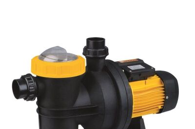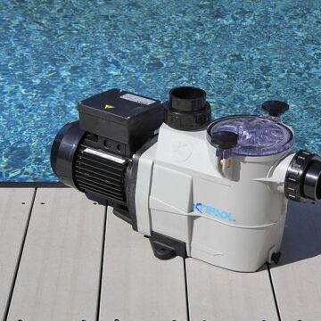 Une pompe de piscine se compose d’un moteur électrique qui entraîne une turbine qui en tournant crée un flux d’eau vers le filtre. Le moteur est refroidi par un ventilateur.