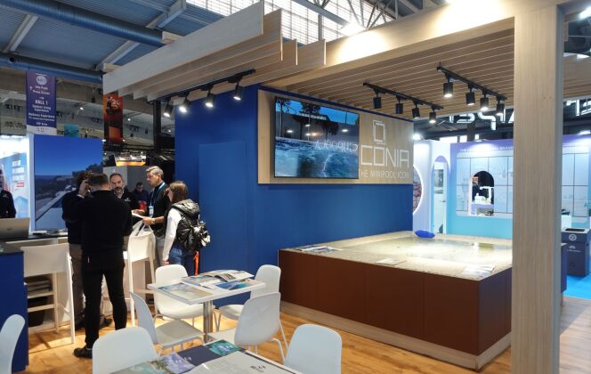 Sur le stand de Compass Pools, une piscine en eau pour une démonstration de nage à contre-courant DR