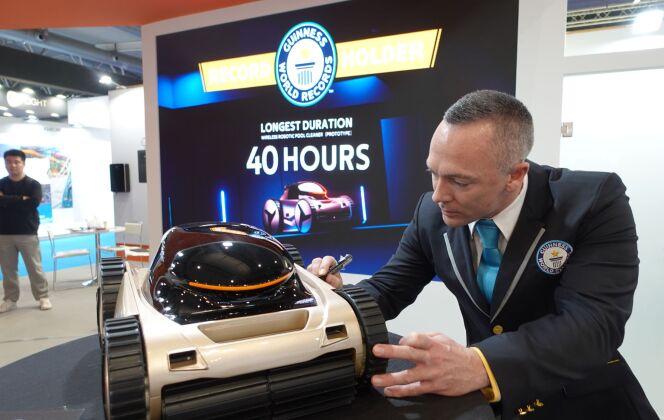 Carl Saville, représentant du Guinness Book of Records, signe le robot de piscine Fairland X-Warrior qui a battu le record du robot de piscine le plus endurant DR