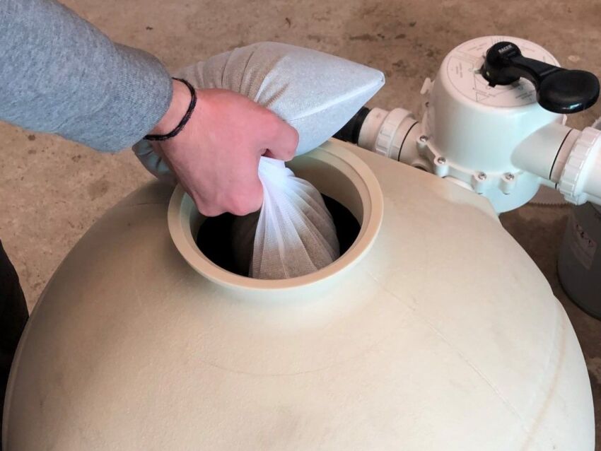 Donc à l'intersaison, on va sortir les SandBag, les nettoyer au jet d'eau normal et les laisser tremper si besoin avant de les remettre en place dans le filtre. On n'utilise pas de jet haute pression mais on malaxe un peu chaque sac jusqu’à ce que l’eau redevienne claire. Cela prend une heure contre une matinée pour une charge filtrante classique.