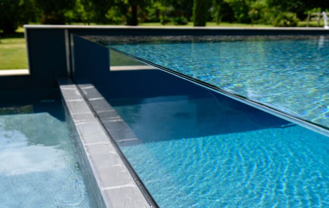 La piscine est équipée d'un débordement sur une paroi de verre © Piscines Sud Océan / l'esprit piscine - photo : Fred Delouvée