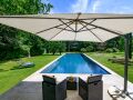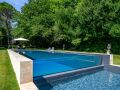 Cette piscine privée extérieure de 15 x 4,50m en béton armé isolé est équipée d’une paroi vitrée et d’un débordement. Son étanchéité est assurée par une membrane armée 150/100e grise sur un fond plat à 1,45m.