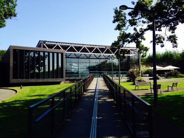Lors des beaux jours, les nageurs peuvent profiter d'un espace extérieur avec transats et espaces engazonnés.