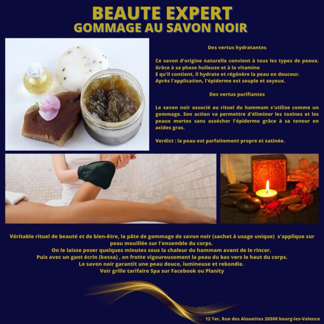 Au sein de l'institut Beauté Expert, vous pouvez retrouver un espace Bien-Être Spa. Cet espace privatisé, contemporain et moderne regroupe un vestiaire, une douche, un jacuzzi thérapeutique et relaxation 63 jets ainsi qu'un hammam (pièce chaude à vapeur). En plus de ces équipements, l'institut propose des soins tels que le gommage au savon noir et gant de crin ainsi que le modelage du corps.